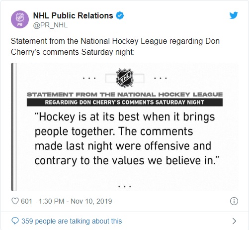 The National Hockey League said in a statement that Cherry's remarks were ``offensive and contrary to the values we believe in.''