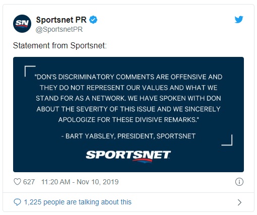``Don's discriminatory comments are offensive and they do not represent our values and what we stand for as a network,'' Sportsnet President Bart Yabsley said in a statement earlier Sunday. ``We have spoken with Don about the severity of this issue and we sincerely apologize for these divisive remarks.''