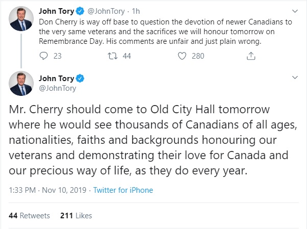 Mayor John Tory weighed in on the controversial comments as well via Twitter.