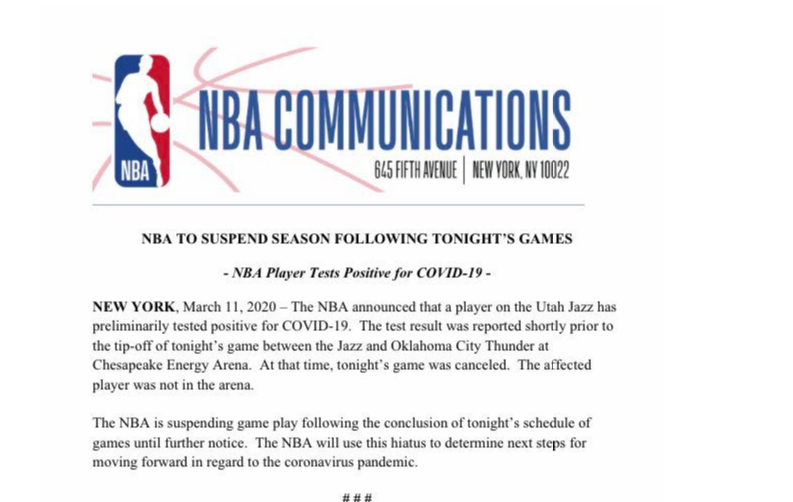 ``The NBA is suspending game play following the conclusion of tonight's schedule of games until further notice,'' the league said in a statement sent shortly after 9:30 p.m. EDT. ``The NBA will use this hiatus to determine next steps for moving forward in regard to the coronavirus pandemic.''