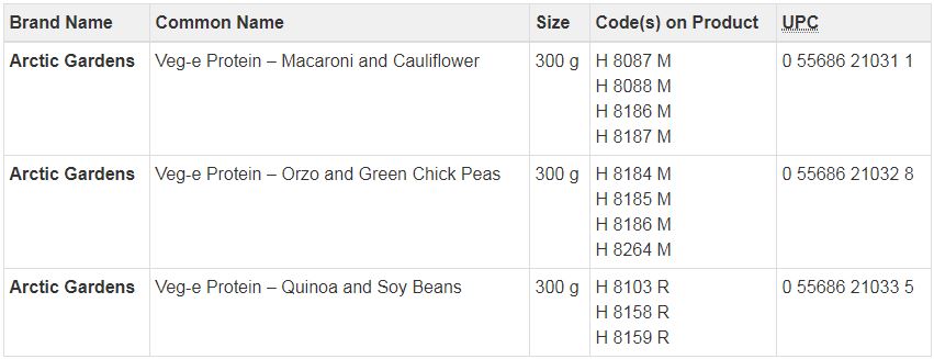 The products were sold in New Brunswick, Ontario and Quebec, and include macaroni and cauliflower, orzo and green chick peas, and quinoa and soy beans.