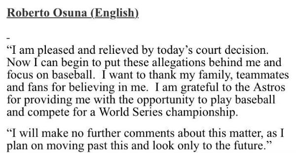Osuna's lawyer, Domenic Basile, told court that his client's agreement to enter the peace bond was not to be construed as an admission of guilt, and that the player had insisted all along he was not guilty.
