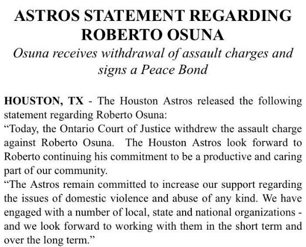 In a statement the Astros said the team is committed to increasing supports around domestic violence.
