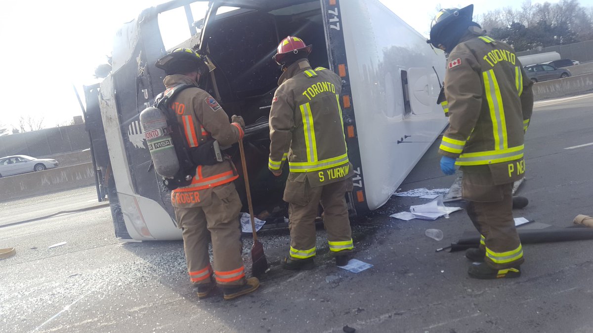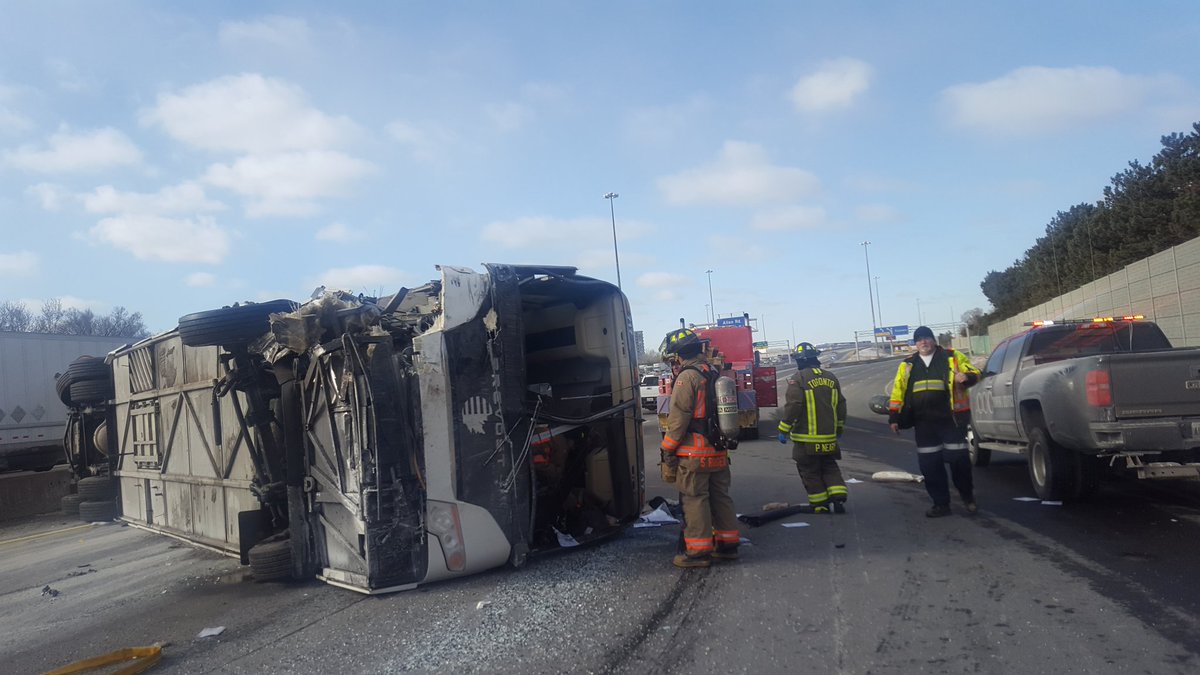 It is a startling sight: a coach bus, flipped on its side laying across virtually all lanes on a stretch of Hwy 401.