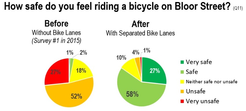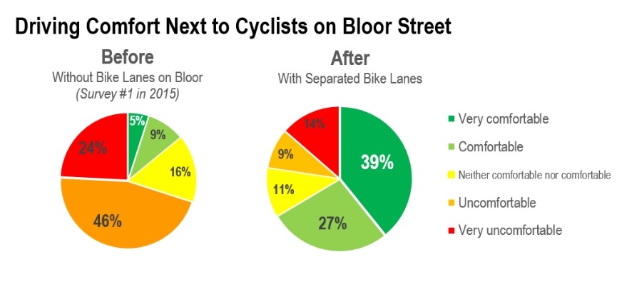 Previously shared data from a survey of cyclists and drivers did find both groups feeling safer and more comfortable together on Bloor with the separated bike lanes.