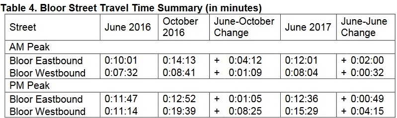 In June, data showed a westbound drive between Bay St and Ossington Ave during the afternoon rush took 8.5 minutes longer than it did before the bike lanes. Now city staff says that same drive is four minutes longer than it was before the pilot.