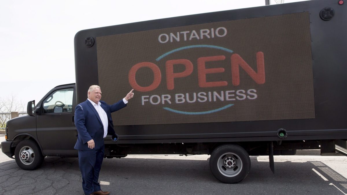 In May, Ford repeated the promise at a news conference overlooking Niagara Falls alongside a truck with a digital sign on its side displaying"ONTARIO OPEN FOR BUSINESS".