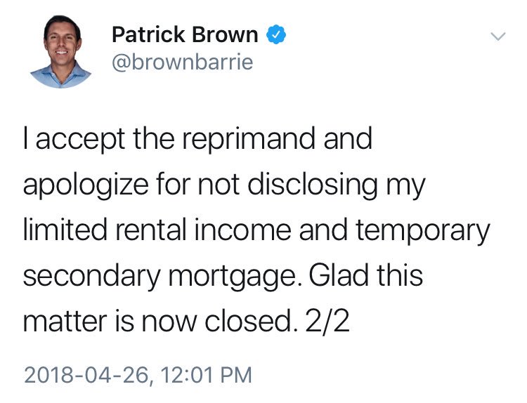 In a post on Twitter, Brown says he accepts the reccomended reprimand and apologizes for not disclosing "limited" rental income and a temporary second mortgage.