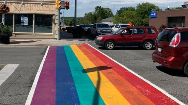 The crosswalk was unveiled Thursday morning, in support of the LGTBQ2 community and according to the town,as “a symbol of acceptance and support of diversity and inclusiveness”